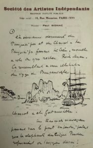 Deux lettres sont ornées d’un dessin autographe de Paul Signac – un paysage au crayon sur une carte-lettre [n°9] (7 x 11 cm) et une vue à l’encre figurant le Ville-d’Honolulu [n°10] (6 x 13,5 cm), au-dessus duquel il a lui-même écrit : « Ça ressemble à une illustration du Voyage de Bougainville » – et sept autres lettres comportent un croquis de sa main, relatif à la navigation le plus souvent – le chavirement d’un chalutier [n°18], un plan de village [n°55], une barque [n°59], une coupe de la Henriette II [n°66], un canot [n°78], un gouvernail et un fond de cale [n°94], ou deux schémas d’accident naval [n°96].