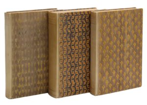 Londres, Putnam & Co., [1946-1948]. Ensemble 3 volumes in-8, demi-vélin ivoire, plats de papier décoré, tranches jaunes, couverture (Anker Kysters Eftf., 1957).Première édition anglaise de The Angelic Avengers (1946), publié sous le pseudonyme de Pierre Andrézel, et rééditions de Out of Africa (1948) et de Seven Gothic Tales (1948), ce dernier sous le pseudonyme de Isak Dinesen.