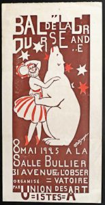 Ticket d'entrée pour le bal. Joint : Bal de la Grande Ourse. Organisé par l'Union des Artistes Russes à Paris, à la Salle Bullier, le vendredi 8 mai 1925. Affiche, 49,5 x 32,5 cm, impression recto verso en brun sur vergé teinté, illustrée d'un bois de Henri Laurens, d'un bois constructiviste (de Larionov ?), de la constellation de la Grande ourse, de portées musicales, etc. Bal dont le thème est l'architecture constructiviste et dont (que "l'appellation de la Grande Ourse n'aille pas vous fournir des suggestions au sujet du costume" !). Signataires : Bernouard, Brunelleschi, Bourdelle, Brancuzi, Cendrars, Chagall, Delaunay, Foujita, Gleize, Laboureur, Soupault, Tzara, Valadon, etc.