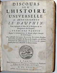 Édition originale dédiée au Dauphin, fils de Louis XIV, dont Bossuet fut le professeur d'histoire de 1670 à 1679. Dans cet ouvrage absolutiste composé vers 1677, l'Histoire, qui va de la Genèse à Charlemagne, est présentée comme une suite de manifestations de la Providence et lie la royauté française à la divinité. Illustré d'un bandeau, une lettrine et un cul-de-lampe gravés par Jollain d'après Le Pautre et d'une vignette aux deux cigognes, marque de l'éditeur, sur le titre. # Tchemerzine II-365; # Le Petit 419-420; # Brunet I-1134; # Printing and the Mind of Man, 157.
