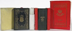 Almanach de Gotha. Gotha, Justus Perthes, Années 1815, 1816, 1833, 1834, 1843, 1870 et 1944. 7 vol., pet. formats, qqs illustrations (qqs lég. us. au sinon en bonne condition, cachets à sec armoriés non identifiés). Cartonnages d'édition...