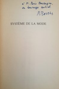 Système de la Mode. Paris, Le Seuil, 1967. In-8, broché. Édition originale, sans grand papier. Envoi autographe signé à Pierre Descargues.
