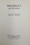 Michelet par lui-même. Images et textes présentés par Roland Barthes. Paris, Le Seuil, 1954. In-12, broché. Édition originale. Exemplaire du service de presse. Envoi autographe signé : « Amitié fidèle, R. Barthes. »