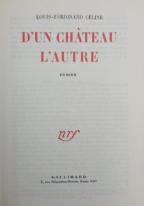 D'un château l'autre. Paris, Gallimard, 1957. In-12, bradel toile noire décorée de l'éditeur. Édition originale. Un des 850 exemplaires sur vélin labeur reliés d'après la maquette de Paul Bonet.