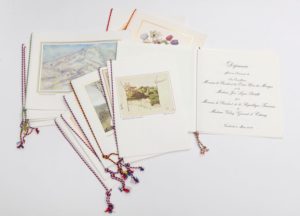 GASTRONOMIE.— Ensemble de 13 menus de la présidence de la République à l'étranger sous le mandat de Valéry Giscard d'Estaing. 1978-1980. In‑8, in‑8 oblong & in‑4, couvertures illustrées, cordelettes tricolores ou aux couleurs de l'État de la personnalité invitée. Déjeuners pour le président allemand au château d'Ernich, pour le chancelier Helmut Schmidt à Aix-la-Chapelle, pour le président Ceausescu à l'ambassade de France à Bucarest, pour le président mexicain à l'ambassade de France à Mexico, à Kigali au Rwanda, à Bombay, etc. Dîners pour le roi d'Espagne au palais royal d'Aranjuez, pour Léonid Brejnev à l'ambassade de France à Moscou, pour le président allemand au château d'Ernich, pour Zhao Ziyang à l'ambassade de France à Pékin, pour le président indien à l'ambassade de France à New Delhi, pour le président brésilien à Brasilia, pour l'émir d'Abou Dhabi à Abou Dhabi, etc.