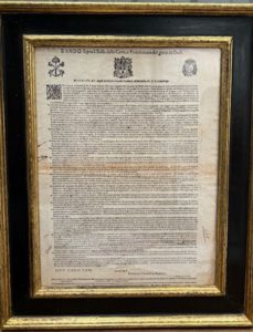 JEUX.— Bando sopra il bollo delle carte, e prohibitione del gioco de dadi. Rome, Imprimerie de la chambre apostolique, 1627. Placard imprimé in‑folio, 43,5 x 32,5 cm, encadré postérieurement. Décret du 12 mars 1627 pris par le cardinal Ippolito Aldobrandini (1594-1638), camerlingue de la Sainte Église, interdisant les jeux de cartes et de dés dans les États de l'Église. Armes du pape Urbain VIII, armes du cardinal Aldobrandini et marque de la chambre apostolique, gravées sur bois en tête du document. Soulignures et notes marginales anciennes. Pliure centrale. Document non examiné hors de son cadre.