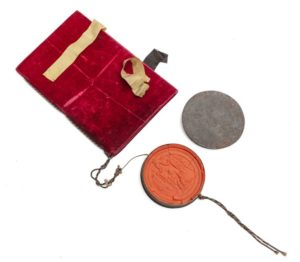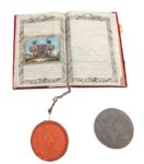 NOBLESSE.— Brevet de noblesse des Pays-Bas autrichiens, signé par Joseph II, empereur du Saint-Empire. Vienne, 6 avril 1784. Manuscrit in‑folio, 22,5 x 34 cm, calligraphié à l'encre sur peau de vélin, 1f. blanc, 5ff., cartonnage de l'époque en velours bordeaux, gardes dorées, 3 (sur 4) attaches (larges rubans de soies noire et or), large sceau de cire rouge (13,7 cm de diamètre) appendu dans une boîte en fer-blanc, lacs tressé de cordelettes noires, or et argent. Titre de baron délivré à Lambert Antoine de Fromantau de Ruyff (1721-1788), de Liège. Texte en français. Larges armoiries peintes en couleurs (17 x 13,5 cm) au verso de troisième feuillet. Première page entièrement gravée, encadrement gravé sur les 7 pages suivantes. Importantes inscriptions d'enregistrement signées au recto et au verso du dernier feuillet. Beau document. Large oxydation dans le bas des gardes ayant fragilisé la moitié inférieure des gardes volantes de papier, avec manque important. Décharge de l'or des gardes et de la peinture sur les feuillets. Sceau cassé sans manque, accidents au lacs.