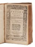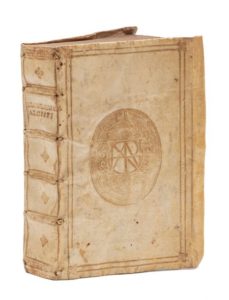 ALCIAT (André). Omnia Andreae Alciati V. C.  emblemata cum commentaris : quibus emblematum omnium aperta origine, mens auctoris explicatur, & obscura omnia dubiaque illustrantur per Claudium Minoem. Anvers, Christophe Plantin, 1581. Petit in‑8, 16,5 x 11 cm, 11ff., 1 f. blanc, 782pp., 1 f., reliure souple à rabats de l'époque en vélin doré, double filet doré en encadrement et médaillon central orné avec chiffre AHNOR doré sur les plats, dos orné de faux-nerfs et de motifs dorés, tranches dorées. Charmant exemplaire de ce célèbre livre d'emblèmes en vélin doré de l'époque. Nouvelle édition augmentée, la troisième publiée chez Plantin avec le commentaire de Claude Mignault (la première parut en 1573). L'édition originale fut publiée en 1531. Elle contient 211 emblèmes, le dernier mal chiffré CCXIII. Illustrée d'un titre-frontispice dans un bel encadrement gravé et de 211 figures gravées sur bois par Gérard van Kampen d'après Virgil Solis sauf celles signées du monogramme « A ». Exemplaire au chiffre, réglé. Des bibliothèques Lambert-Lesage (étiquette) et Nepveu. Essais d'écriture et de notations de musique anciens au verso du dernier feuillet. Papier uniformément mais légèrement bruni. Quelques rousseurs. Vélin très légèrement taché, lacets manquants. Coutures un peu lâches. Voet, I, 29. - Landwehr (Low Countries) n° 14.