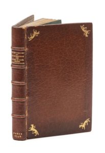 [CORROZET (Gilles)]. Le cathalogue des villes et cités assises ès trois Gaulles, avec ung traicté des fleuves & fontaines… Paris, Antoine Bonnemère, 1540. In‑16, 7,5 x 12 cm, 8 + 71ff., reliure du xixe siècle, signée Saulnier, en maroquin brun, pièces d'armes angulaires dorées sur les plats, dos à nerfs, dentelle intérieure dorée, tranches dorées. Nouvelle édition sous ce titre des Antiques érections des Gaules publiées en 1531. Illustré de 35 figures sur bois représentant principalement des villes de France et de Belgique. Suivi d'un texte sur les fleuves et fontaines du royaume par Symphorien Champier, et d'un autre sur les lieux saints de France par son fils Claude Champier. Bon exemplaire, de la bibliothèque Lubersac (pièces d'armes). Reliure insolée, mors frottés.