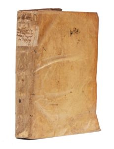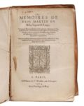 DU BELLAY (Martin). Les mémoires de mess. Martin du Bellay, seigneur de Langey, contenans le discours de plusieurs choses advenües au royaume de France, depuis l'an M.D.XIII. jusques au trespas du roy François premier, ausquels l'autheur a inséré trois livres, & quelques fragmens des Ogdoades de mess. Guillaume du Bellay seigneur de Langey son frère. Oeuvre mis nouvellemēt en lumière. par mess. René du Bellay… héritier d'iceluy… Paris, P. L'Huillier, 19 janvier 1569. In‑folio, 22,5 x 32,5 cm, 6 + 136 + 10 + 226ff. (mal chiffrés 137-350) + 6ff., reliure de l'époque en vélin ivoire à recouvrement, dos lisse, étiquette de papier avec titre à l'encre au dos, traces d'attaches. Édition originale des mémoires du diplomate et historien Martin du Bellay (1495-1559), frère du cardinal Jean du Bellay et oncle de célèbre poète, comprenant les mémoires de son frère Guillaume (1491-1543). Belle impression parisienne de L'Huillier avec d'élégants bandeaux et lettrines. Marque de l'imprimeur sur le titre. Exemplaire grand de marges. Mention manuscrite ancienne de la bibliothèque des augustins de Tours sur le titre. Ex-libris manuscrit contemporain gratté en tête et cote marginale à l'encre sur le titre. Ratures et signature contemporaine à l'encre au verso du titre. Quelques petites taches dans le volume. Mouillure dans la gorge au début du volume. Gorges fendues. Vélin légèrement froissé, étiquette du dos frottée avec petits manques.