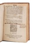 FONTEVRAUD.— [Yves MAGISTRI]. Baston de deffence, et mirouer des professeurs de la vie régulière de l'abbaye & ordre de Fontevrault : dont l'érectio[n] & propagation sera récitée au présent volume, avec la très-saincte conversation du législateur d'iceluy. Mis en lumière pour la très illustre & révérende mère abbesse, religieux & religieuses de l'abbaye & ordre de Fontevrault. Angers, Anthoine Hernault, 1586. In‑8, 13 x 19 cm, 72pp., 212pp. (sur 216 ; mal chiffrés 214), reliure de l'époque en veau brun moucheté, dos à nerfs orné de motifs dorés. Rare impression angevine. Chronique de l'abbaye de Fontevraud rédigée sous l'abbatiat d'Éléonore de Bourbon, sœur d'Antoine de Bourbon, roi de Navarre et grand-père de Henri IV. Marque de l'imprimeur sur le titre. Manque le dernier feuillet de texte (Ddd1) et le dernier feuillet (Ddd4). Mouillure aux 3 premiers et aux 3 derniers cahiers. Ex-libris manuscrit sur 4 lignes sur le titre, biffé anciennement. Annotations marginales anciennes à l'encre. De la bibliothèque Nepveu (étiquette moderne). Mors frottés.