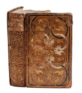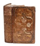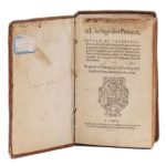 GUEVARA (Antonio de). L'orloge des princes, œuvre de très excellente & admirable doctrine, pour les graves sentences, & rares hystoires, qui y sont contenues… Paris, Charles l'Angelié, 1550. In‑8, 10,5 x 16,5 cm, 12 + 423ff., reliure de l'époque en veau fauve, fond criblé doré avec encadrement peint en noir, large décor d'entrelacs dorés et peints en noir et en blanc et extrait d'un vers de l'Énéide, Si te fata vocant, doré au centre sur les plats, dos lisse entièrement orné de motifs dorés, pièce de papier avec titre à l'encre noire, décors dorés aux coupes, tranches dorées. Édition parisienne, partagée entre plusieurs libraires, du Relox des príncipes, traité du prince chrétien, de l'évêque et inquisiteur espagnol Antonio de Guevar (1481-1545), adapté de sa biographie romancée de l'empereur Marc Aurèle. L'ouvrage, publié pour la première fois en castillan en 1529 et en français en 1540, est traduit par René Berthault, secrétaire du cardinal de Grantmont et membre de la cour de la reine Marguerite de Navarre. Belle impression parisienne ornée de belles lettrines à fond criblé. Marque de l'imprimeur sur le titre. Exemplaire en reliure décorée de l'époque, réglé à l'encre rouge. De la bibliothèque Lambert-Lesage (étiquette au premier contreplat ; n° 1327), puis Nepveu. Signatures anciennes, dont une effacée, sur le titre. Titre taché en tête, quelques feuillets effrangés, deux cahiers très légèrement déboîtés. Mors entièrement fendus, coins usés, plats frottés, trous de ver au dos.