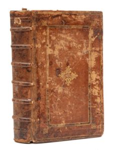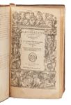 LEMAIRE DE BELGES (Jean). Les illustrations de Gaule et singularitez de Troye… Avec La couronne margaritique… Lyon, Jean de Tournes, 8 octobre 1549. In‑folio, 21 x 34 cm, 8ff., 424 + 10pp., 1 f. blanc, 80 + 72pp., reliure de l'époque en veau fauve, encadrements de filets dorés et de bandes peintes en brun avec fleurons angulaires et motif central dorés sur les plats, dos muet à nerfs orné de petits fleurons dorés, tranches dorées. « Édition la plus belle et la plus complète de ce recueil » (Brunet), donnée par Antoine du Moulin, de Mâcon. Historiographe de Marguerite d'Autriche, Jean Lemaire (1473-1524) composa à sa mort un poème panégyrique, La couronne margaritique, resté manuscrit et publié ici pour la première fois. Belle impression lyonnaise de Jean de Tournes. Titre dans un bel encadrement architectural orné de figures allégoriques, gravé sur bois. Lettrines gravées sur bois. Signature allemande, datée 1553, et longue note manuscrite du xviie siècle sur les auteurs, sur les gardes blanches. Importante mouillure dans le bas du volume, quelques déchirures marginales sans manque. Reliure usée, mors fendus, plats épidermés, coiffes arrachées. Relié à la suite : GILLES (Nicole). Les treselegantes & copieuses annales et croniques, des treschrestiens & excellens modérateurs des beliqueuses Gaulles… Paris, Robert Masselin, 1er avril 1551. 2 vol., 6 + CXXXff. & 6 + CXLVff. Importante réédition largement illustrée de beaux bois gravés. Titre dans un bel encadrement architectural gravé sur bois. Petite déchirure sans manque en marge du titre. Petites galeries de ver en marge de quelques feuillets.
