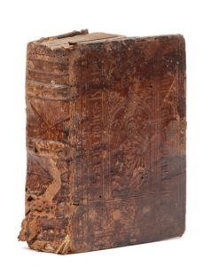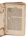 NORMANDIE.— [Coutumes de Normandie]. [Suivi de] Le stille de procéder en Normendie. Rouen, Richard Auzou pour Robert Macé à Caen, vers 1504-1506. 2 ouvrages en un vol petit in‑8, 9,5 x 13,7 cm, 151ff. (sur 152 ; a-t8) & 82ff. (a-i8, k10), reliure de l'époque en veau brun sur ais, décor à froid composé de roulettes, de bandes, d'inscriptions et de plaques sur les plats, dos à nerfs orné de filets à froid, trace de fermoir. Réunion de deux rares impressions gothiques rouennaises. Belles marques à la sirène du libraire-éditeur Robinet Macé, en rouge sur le titre du Stille et en noir au verso des derniers feuillets des deux ouvrages, entourées de petits bois historiés. Lettrines à fond noir. Manque le feuillet de titre des Coutumes. Premiers feuillets légèrement effrangés et petite mouillure au début du volume. Inscriptions anciennes au verso de la seconde garde volante et rares petites inscriptions marginales dans l'ouvrage. Petites galeries de ver. Reliure ornée de plaques à froid représentant le Christ sur le premier plat et sainte Barbe sur le second. Elle porte des marques d'usure, avec une partie de l'ais du second plat manquante, important manque en queue, coiffe supérieure frottée. Frère, I, p. 300 (« Rare édition ») & II, p. 548 (« vers 1500 »).