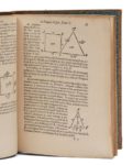 BESSON (François). La pratique de géométrie… divisée en trois livres… Ensemble les IV. & XIII. livres des Élémens d'Euclide… Et une poligonométrie. Paris, Jean Moreau, 1626. In‑4, 17,5 x 23 cm, 2ff., 226pp., 1 f., reliure du xixe siècle en demi-basane fauve marbrée, dos orné de faux-nerfs dorés. Édition originale illustrée de nombreuses figures géométriques gravées sur bois. La Poligonométrie a un titre particulier. François Besson était greffier du bureau des finances de la généralité de Languedoïl, à Bourges. Bon état. Importantes traces de terre séchée à quelques feuillets. Pâle mouillure ancienne en fin de volume. Ex-libris manuscrits de l'époque sur le titre Pierre Noiset (le traducteur du Grand art d'artillerie de C. Siemienowicz en 1651 ?). Dos frotté, un coin de la reliure cassé, sans manque.