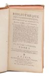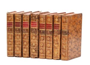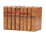 Bibliothèque physico-économique, instructive et amusante. Année 1787. Année 1789. Année 1790. Année 1791. Paris, Buisson, 1787-1791. 8 vol. in‑12, 9,5 x 16 cm, 8 + 424 pp, 2pl. repliées & XXIV + 418pp., 3pl. repliées & XXIV + 384pp., 3pl. repliées & 2ff., 476pp., 2pl. repliées & LX + 388 pp. (mal chiffrées 396), 2pl. & XX pp. (mal chiffrées XVIII) + 476 pp. (mal chiffrées 470), 1pl. repliée & XXXVIII + 456pp., 1 tableau replié et 2pl. repliées & 1 f., 450pp., 1 tableau replié et 1pl. repliée, reliures uniformes de l'époque en veau fauve tacheté, dos ornés de faux-nerfs et de motifs dorés. Édition originale, pour les années 1787, 1789, 1790 et 1791, de cette publication annuelle consacrée à l'économie rurale, l'agriculture, l'histoire naturelle, les arts et métiers, l'art vétérinaire, l'alimentation (dont des articles de Parmentier), la physique, la chimie, etc. Illustré de 16 planches gravées et repliées. Ce périodique fut publié de 1782 à 1831. Bon état. Quelques coiffes usées, trous de ver aux dos et aux mors de trois volumes.