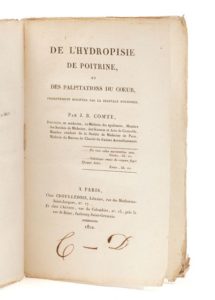 COMTE (Jean-Baptiste). De l'hydropisie de poitrine et des palpitations du cœur, promptement dissipées par la digitale pourprée. Paris, Croullebois, l'auteur, 1822. In‑8, 13,5 x 21,5 cm, 2ff., 98pp., broché, couverture muette, non rogné. Édition originale de cette étude médicale sur un traitement par la digitale, plante toxique aux propriétés tonicardiaques. Fente au dos.