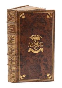 DAUPHINÉ.— Jean TARDIN. Histoire naturelle de la fontaine qui brusle près de Grenoble. Avec la recherche de ses causes, & principes, & ample traicté des feux sousterrains… Tournon, Guillaume Linocier, 1618. In‑12, 7,5 x 14 cm, 12ff., 380pp., 1 f., 1 f. blanc., reliure du xixe siècle en veau fauve marbré, triple filet doré en encadrement et fleurons angulaires sur les plats, armes dorées au centre du premier plat, dos à nerfs orné de motifs dorés. Édition originale peu courante. Premier tirage, avec la vignette de titre allégorique gravée sur bois et signéeCM et l'inversion de deux pages dans la table (chapitres  VIII à XIII). Décrivant la fontaine ardente du Gua en Isère, il s'agit du premier livre français sur le pétrole. Bel exemplaire de la bibliothèque d'Alix de Tournon-Simiane (1813-1886) avec armes sur le plat et ex-libris héraldique.