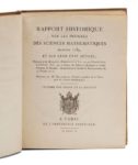 DELAMBRE (Jean-Baptiste). Rapport historique sur les progrès des sciences mathématiques depuis 1789, et sur leur état actuel… Paris, Imprimerie impériale, 1810. In‑4, 20 x 25,5 cm, VIII + 272pp., reliure de l'époque en demi-veau fauve glacé, dos orné de faux-nerfs et de motifs dorés. Édition originale. Important état de l'avancée des mathématiques, de la physique, de la mécanique et de l'astronomie, de la géographie et des expéditions, ainsi que des arts et métiers sous l'Empire. Le grand mathématicien et astronome Delambre (1749-1822), qui fut l'un de ceux qui définirent le mètre, était directeur de l'observatoire de Paris et professeur au Collège de France. Il était membre de l'Académie des sciences. Très bon exemplaire. Mors et coiffes légèrement frottés.