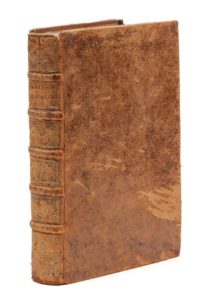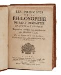 DESCARTES (René). Les principes de la philosophie de René Descartes. Quatrième édition. Reveuë & corrigée fort exactement par monsieur CLR. Avec des figures dans le corps du livre ; et celles en taille-douce, de la première édition, mises à la fin du livre. Paris, Théodore Girard, 1681. In‑4, 17,5 x 23 cm, 30ff., 478pp., 1 f., 22pl., reliure de l'époque en basane fauve, dos à nerfs orné de motifs dorés. Quatrième édition, traduite du latin, éditée par Claude Clerselier (1614-1684), avocat au parlement de Paris. Illustré d'une planche gravée sur bois et repliée, d'une suite gravée sur cuivre comprenant un titre et 20 planches, et de figures gravées sur bois dans le texte. Bon état. Mouillure à plusieurs feuillets, légères rousseurs, petit trou planche X, tache d'encre planche XII. Reliure très frottée, coiffe supérieure et haut du dos manquants.