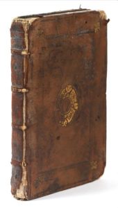 FERNEL (Jean). De abditis rerum causis libri duo… Francfort, André Wechel, 1574. In‑12, 10 x 16,5 cm, 272pp., 12ff., reliure de l'époque en veau brun, médaillon doré au centre des plats, dos à nerfs. L'un des grands traités de Jean Fernel (1506-1558), né à Montdidier, en Picardie, premier médecin du roi HenriII, consacré aux épidémies et aux maladies contagieuses, dont la syphilis et la rage. Beau portrait de l'auteur gravé sur bois à pleine page. Marque de l'imprimeur sur le titre et la dernière page. Ex-libris Delaunaye (xixe siècle). Longue note bio-bibliographique manuscrite ancienne au verso de la première garde volante. Piqûres, quelques petites taches et galeries de vers. Reliure de l'époque à médaillon, usée.