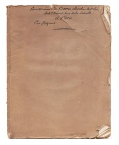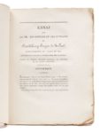 FREYCINET (Louis de). Essai sur la vie, les opinions et les ouvrages de Faujas de Saint-Fond. Valence, Imprimerie de Jacques Montal, 1820. In‑4, 21,5 x 28 cm, 2ff., 56pp., broché, non rogné. Édition originale de cet éloge du grand savant décédé quelques mois auparavant par Freycinet, explorateur et savant, membre de l'Académie des sciences et un des fondateurs de la Société de géographie. Avec deux textes inédits de Faujas de Saint-Fond : « Dernière promenade géologique » qui contient la copie d'une lettre de Joseph Montgolfier, à propos d'aérostation, adressée au comte d'Artois, et « Discours… à l'ouverture [du] cours de géologie fait au jardin du roi ». Avec une importante « Notice bibliographique relative aux ouvrages publiés par Barthélemy Faujas de Saint-Fond ». Bon exemplaire dans sa condition de parution. Ex-dono autographe de l'auteur à N. du Barrou qui habitait l'hôtel de Nesmond à Paris, sur la couverture muette, déchirée sans manque.