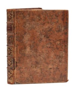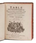 GODIN (Louis). Table alphabétique des matières contenues dans l'Histoire & les Mémoires de l'Académie royale des sciences… Tome premier. Années 1666-1698. Paris, La compagnie des libraires, 1734. In‑4, 19 x 24 cm, 1 f., 380pp., reliure de l'époque en veau fauve marbré, triple encadrement doré sur les plats, dos à nerfs orné de motifs dorés. Premier volume seul de l'index thématique de la monumentale Histoire de l'Académie des sciences, commencée par Fontenelle, et des Mémoires… de cette académie. La série complète de la Table… comprend 10 volumes, parus de 1729 à 1809. L'astronome Louis Godin (1704-1760) fut membre de l'Académie des sciences en 1725. Bon état. Reliure frottée avec petites fentes aux mors, coins usés.