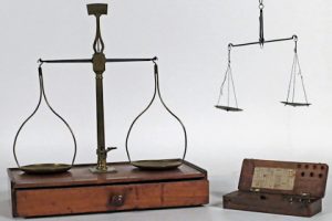 Joint : Trébuchet ou balance monétaire. 19e siècle. Acier et laiton, sous boïte en noyer avec couvercle et fermoirs (6 x 16,5 x 3 cm), étiq. imprimée en français collée à l'intérieur du couvercle. Contient 7 poids monétaires en cuivre (incomplet).