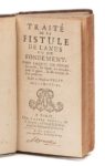 LE MONNIER (Louis). Traité de la fistule de l'anus ou du fondement… Paris, Laurent Rondet pour Amable Auroy, 29 octobre 1689. In‑12, 8,5 x 15,5 cm, 1 f. blanc, 17ff., 228pp., reliure de l'époque en basane fauve, dos à nerfs orné de motifs dorés. Édition originale dédiée à Charles-François Félix, le chirurgien qui opéra avec succès Louis XIV d'une fistule anale en 1686. Signature ancienne en bas du titre. Reliure frottée, coiffes et coins usés, fentes aux mors.