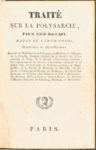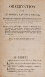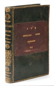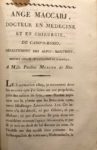 MACCARY (Ange). Réunion de 7 ouvrages et brochures. In‑12, 11,5 x 17 cm, reliure italienne du milieu du xixe siècle en veau vert, chaînette dorée en encadrement sur les plats, dos orné de faux-nerfs et de motifs dorés. Important ensemble d'éditions originales de textes concernant l'obésité, les maladies de l'homme et des plantes, les scorpions et les insectes. Est relié in fine, le texte de trois lettres du dr Ange Maccary (1 f. chacune) à Marie Galléana, Mme Pallavicini et Pauline Mercier, indiquant à chacune qu'il donne leur nom à des insectes qu'il a découvert. Bon exemplaire sans doute destiné par l'auteur à l'empereur (étiquette en basane aubergine sommairement collée sur le premier plat avec mention : À S. M. impériale Louis Napoléon III). Deux extraits de presse concernant les œuvres de l'auteur sont collés au second contre-plat. Importantes rousseurs, quelques taches. Détail : • Traité sur la polysarcie. Paris, [Crochard, chez l'auteur ; Gènes, Andréas Frugoni ; Turin, Pic, 1811]. 2ff., 192pp. Second tirage de la page de titre, mentionnant les dernières sociétés savantes que l'auteur venait de rejoindre. Deux feuillets de critiques de l'ouvrage, en italien (vers 1820), ont été reliés en tête et in fine. • Observation sur le béribéri sthénique… Paris, Gabon, chez l'auteur ; Turin, Pic ; Florence, Molini et Landi ; Gènes, Andréas Frugoni ; Milan & Pavie, Galeazzi, 1810. 16pp. • Relazione… d'un' angina di petto, da noi poco conosciuta, e da W. Heberden descritta nell' anno 1772 col nome di angina pectoris. Nice, typographie Canis et fils, [1838]. 8pp. • Relazione ed osservazioni… intorno alla malattia del signor Giuseppe Chartroux… Nice, typographie Canis et fils, [1833]. 60pp. • Mémoire sur la gangrène humide du mûrier. Paris, Gabon, 1811. 16pp. Signature de l'auteur sur le titre. • Mémoire sur le scorpion qui se trouve sur la montagne de Cette, département de l'Hérault, son venin, et l'usage qu'on pourrait en faire en médecine. Paris, Gabon, chez l'auteur ; Turin, Pic ; Florence, Molini et Landi ; Gènes, Andréas Frugoni ; Milan & Pavie, Galeazzi, 1810. 1 f., 48pp. Signature de l'auteur sur le titre. Correction et note marginales manuscrites à l'encre. Petit extrait de presse concernant l'ouvrage relié entre le faux-titre et le titre. • Observation sur le bombix pavonia major… Paris, Gabon, chez l'auteur ; Turin, Pic ; Florence, Molini et Landi ; Gènes, Andréas Frugoni ; Milan & Pavie, Galeazzi, 1810. 16pp.