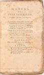Manuel des jeux de hasard, considérés sous tous leurs rapports, ou Exposition raisonnée des moyens les plus probables de jouer avec avantage la loterie, le trente-un, la roulette, le passe-dix, ou pair et impair, le biribi etc… par H. E. B. C. Paris, Barthelemy, Pollet, Bidault, vers 1810. In‑12, 10,5 x 18 cm, 1 f., 105pp., broché, non rogné. Petit traité destiné à démontrer mathématiquement que « la passion du jeu est la plus dangereuse de toutes » et qu'elle est « un impôt indirect sur les fous ». Importante mouillure marginale ancienne, rousseurs. Couverture en partie détachée avec manques de papier au dos.
