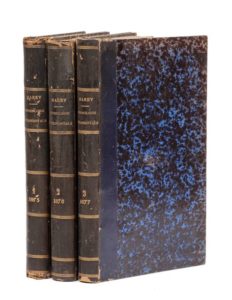 MAREY (Etienne-Jules). Physiologie expérimentale. Travaux du laboratoire de M. Marey. Années 1875-1876-1877. Paris, G. Masson, 1876-1877. 3 vol. in‑8, 15 x 23,5 cm, 2ff., VIpp., 1 f., 388pp. & 2ff., VIII + 420pp. & 2ff., IV + 360pp., 1 f., reliure de l'époque en demi-basane bleue, dos ornés de faux-nerfs dorés. Édition originale des trois premiers volumes de ce recueil d'articles scientifiques de Marey et de son équipe de collaborateurs (résistance de l'air, pulsion du cœur, vol mécanique, etc.) Un quatrième volume parut en 1880 (années 1878-1879). Illustré de nombreuses gravures sur bois. De la bibliothèque du professeur Charles Livon (1850-1917), célèbre médecin marseillais, créateur de l'Institut Pasteur de Marseille, ville dont il fut maire en 1895 (cachet humide). Rousseurs. Accidents aux reliures, un dos en partie arraché.