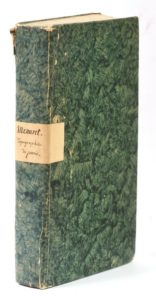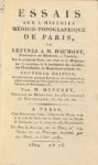 MENURET (Jean-Joseph). Essais sur l'histoire médico-topographique de Paris, ou Lettres à M. d'Aumont… sur le climat de Paris, sur l'état de la médecine… sur l'inoculation, le magnétisme animal, etc. Nouvelle édition, augmentée de quelques lettres sur les changemens et objets nouveaux que Paris présente depuis 1785, sur la vaccine, le galvanisme, etc. Paris, Méquignon l'Aîné, A. Bouvier, 1804. In‑12, 10 x 16,5 cm, XXXVI + 360pp., cartonnage de l'époque. Seconde édition, augmentée de 78pp. par rapport à la première édition de 1786. Médecin de la comtesse d'Artois, Menuret (1739-1815) rédigea près de 80 articles de l'Encyclopédie… Ses Essais… portent sur la médecine à Paris, la petite vérole, l'inoculation, le galvanisme, etc. Bon état. Cartonnage très légèrement frotté.