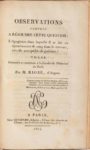 MONTAIN (Frédérik) & Claudius MONTAIN. Traité de l'apoplexie… Paris, Imprimerie de Feugueray pour Brunot-Labbe, 1811. In‑8, 12 x 19,5 cm, XVI + 164pp., reliure de l'époque en demi-basane fauve, coins de vélin ivoire, dos orné de faux-nerfs et de motifs dorés. Édition originale de ce traité rédigé par deux médecins lyonnais. Relié à la suite : M. ROBIÉ. Observations propres à résoudre cette question : L'apopléxie dans laquelle il se fait un épanchement de sang dans le cerveau, est-elle susceptible de guérison ? Thèse… Paris, Imprimerie de Feugueray pour Crochard, 1814. 32pp. Édition originale de la thèse d'un médecin d'Angers. Bon état. Coiffe inférieure légèrement frottée.