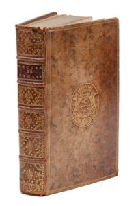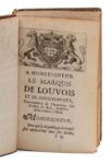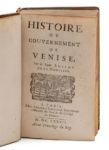 AMELOT DE LA HOUSSAYE (Nicolas). Histoire du gouvernement de Venise.— Supplément…— Mémoire pour servir à la défense de l'Histoire du gouvernement de Venise. Paris, Frédéric Léonard, 1677. 3 ouvrages en un vol. in‑8, 11 x 18 cm, 15ff. (sur 16), 424pp., 19ff. & 200pp., 4ff. & 8pp., reliure du xviiie siècle en veau fauve, triple filet doré en encadrement et armes dorées au centre des plats, dos à nerfs orné de motifs dorés, tranches dorées. Cet ouvrage, paru en 1676, déclencha l'ire des Vénitiens et valut à son auteur, qui fut secrétaire d'ambassade auprès de la Sérénissime, un séjour à la Bastille. Cette seconde édition, augmentée d'un supplément et d'une défense, fut interdite et l'ouvrage mis à l'Index. Bandeau gravé aux armes de Louvois, dédicataire. Le faux-titre et le dernier feuillet blanc du premier ouvrage manquent. Exemplaire aux armes de David-Pierre Perrinet du Pezeau (1697-1767), receveur général des finances de Flandres (OHR 1252, qui cite cet exemplaire). De la bibliothèque Nepveu. Coiffes et coins usés, fentes aux mors.