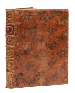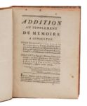 BEAUMARCHAIS (Pierre-Augustin de). Réunion de 4 mémoires concernant l'affaire Goëzman. [Paris], 1773-1775. Un vol. in‑4, 19 x 24,5 cm, reliure de l'époque en basane fauve marbrée, dos à nerfs orné de motifs dorés. Édition originale de quelques factums publiés par Beaumarchais (1732-1799) dans la célèbre affaire qui l'opposa au juriste Goëzman, qui conduisit à la faillite de l'écrivain mais qui le redit populaire par la verve de ses écrits et l'opposition au pouvoir absolu qui y était défendu avec talent. Largement diffusés, ils furent cependant condamnés à être lacérés et brûlés. Bon exemplaire de la bibliothèque de Grace Whitney Hoff, l'une des plus grandes bibliophiles de la première moitié du xxe siècle (ex-libris héraldique gravé). Quelques rousseurs et taches. Coiffes et mors frottés, plats épidermés. Détail : • Addition au supplément du mémoire à consulter… Imprimerie de Ph. D. Pierres, 1774. 78pp., 1 f. blanc. • Mémoire à consulter… Imprimerie de Ph. D. Pierres, 1774. 40pp. • Supplément au mémoire à consulter… Imprimerie de Quillau, 1773. 64pp. • Quatrième mémoire à consulter… Imprimerie de J. G. Cloustier, 10 février 1774. 108pp.