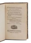 [CHASTENET D'ESTERRE (Gabriel de)]. Considérations sur l'état présent de la colonie française de Saint-Domingue. Ouvrage politique et législatif, adressé au commerce et aux amis de la prospérité nationale. [Paris], octobre 1796. In‑8, 12,5 x 20 cm, X + 304pp., reliure de la seconde moitié du xixe siècle en demi-basane olive, dos orné de faux-nerfs dorés. Édition originale peu courante de cette défense des créoles de Saint-Dominique par l'un d'eux. Propriétaire dans l'île et s'intéressant à son développement agricole et commercial, Chastenet d'Esterre (1760-1812) fut officier de dragons puis économe à l'hôpital militaire de Barèges dans les Pyrenées. Il fut tué, comme son fils unique, durant la campagne de Russie. Bon exemplaire. Chiffre SFM doré en queue. Petite épidermure sur le premier plat.