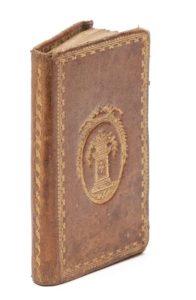 CURIOSA.— L'amour à l'Olympe, ou le triomphe de Cupidon sur les dieux et les déesses. Almanach érotique. Paris, Jubert, [1787]. In‑32, 6 x 9,3 cm, 24pp., titre-frontispice, 12pl., 2 calendriers repliés, reliure de l'époque en basane fauve, roulette dorée en encadrement et médaillon dorée au centre des plats, dos lisse orné d'une roulette dorée en long, tranches dorées, gardes de papier doré. Illustré de 12 planches gravées d'après Dorgez. Coins usés, couture lâche, bifeuillet central détaché.