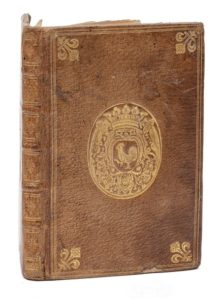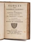 [DOUJAT (Jean)]. Éloges des personnes illustres de l'Ancien Testament pour donner quelque teinture de l'Histoire sacrée à l'usage de monseigneur le duc de Bourgogne. Paris, Imprimerie de Gabriel Martin, 1688. In‑8, 11 x 17,5 cm, 8ff., 102pp. (mal chiffrées 100), reliure de l'époque en maroquin brun, triple filet doré en encadrement, armes dorées au centre et fleurs de lys angulaires dorées sur les plats, dos à nerfs orné de motifs dorés, roulette intérieure dorée, tranches dorées. Édition originale rare de ce recueil poétique, illustrée de 50 portraits en médaillons gravés. Jean Doujat (1606-1688) fut un temps précepteur du dauphin. Il mourut peu de temps après la parution de l'ouvrage. Exemplaire aux armes du chancelier Louis Boucherat (1616-1699), appelé par Colbert au conseil royal des finances et qui succéda en novembre 1685 à Le Tellier comme chancelier de France et garde des sceaux (OHR 1262, fer 3, qui cite cet exemplaire). De la bibliothèque d'Octave Nepveu. La vignette 35 est collée sur la vignette 25 qui avait été tirée par erreur sur la page 68. Quelques rousseurs, déchirures aux pages 3, 69 et 75 atteignant parfois l'image. Reliure passée et légèrement tachée. Coins un peu émoussés, petit manque en pied du plat supérieur.