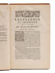 DU CHESNE (André). Histoire généalogique de la maison de Montmorency et de Laval… [Suivi de] Preuves de l'histoire de la maison de Montmorency… Paris, Sébastien Cramoisy, 1624. In‑folio, 21,5 x 33,5 cm, 12ff., 468pp. (mal chiffrées 466), 1 f., 467-696pp., 7ff. & 1 f., 420pp., reliure du xixe siècle en basane fauve racinée. Édition originale. Très nombreux blasons et figures gravés sur cuivre dans le texte. Signature De Sejourné et ex-dono de Mgr de Sansay, manuscrits en haut du titre. Petites notes manuscrites collées en marge despages 213 et 216. Taches page 465. Pâle mouillure marginalepages  511-538 et aux deux derniers cahiers du premier ouvrage. Déchirure sans manque au dernier feuillet des Preuves… Reliure usée, dos manquant.