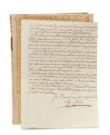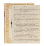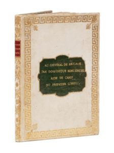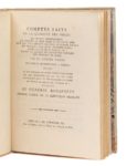 FIANDO (Paul). Comptes faits de la quantité des pièces qui revient mensuellement aux officiers… de l'armée d'Italie… Turin, Imprimerie Fea, 1800. In‑8, 17 x 23,5 cm, 54pp., reliure de l'époque en veau blanc, grecque et filets dorés en encadrement, fleurons angulaires dorés et cartouche de maroquin à grains longs vert avec inscription dorée sur les plats, dos orné de faux-nerfs et de motifs dorés, roulette dorée aux coupes, tranches dorées. Rare et belle impression de Turin, décrite ci-dessus. Avec la copie manuscrite (3 pages in‑8) de la lettre adressée par l'auteur avec cet ouvrage au futur maréchal Jourdan, alors administrateur général du Piémont. Bel exemplaire offert au général Jan Dominique Koscoschi (inscription Au général de brigade Jan Dominique Koscoschi aide de camp du premier consul sur les plats). De la bibliothèque Nepveu.