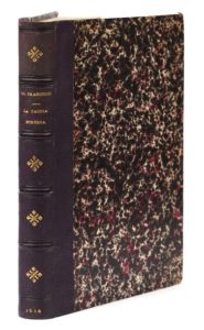 FRANCUCCI (Scipione). La caccia etrusca. Poema. Florence, Giunti, 1624. In‑8, 21,5 x 15,5 cm, 6ff., 400pp., reliure du xixe siècle en demi-chagrin violet, dos à nerfs orné de motifs dorés. Unique édition rare de ce long poème décrivant une chasse de Ferdinand II de Médicis, grand duc de Toscane. Belle impression, principalement italique, avec un encadrement de fleurons typographiques sur chaque page (y compris le titre et les feuillets liminaires) et un argomento dans un encadrement historié aux armes de Florence et des Médicis, gravé sur bois, au début de chacun des seize chants. Armes du cardinal de Médicis gravées sur bois sur le titre. Bon exemplaire, bien complet des 2 feuillets d'Apologia qui manquent parfois, malgré quelques défauts (raccommodage sommaire avec manque de papier et de quelques lettres au second feuillet de l'Apologia, feuillets roussis, quelques taches d'encre, notamment aux premiers feuillets et - plus claires - dans le volume, petite déchirure sans manque à un feuillet.) Écritures anciennes à l'encre sur le titre. Des bibliothèques de fra Angelo Antici, collectionneur italien du xviie siècle (ex-libris manuscrit sur le titre) et du baron Octave Grandjean d'Alteville, qui possédait une des plus riches bibliothèques cynégétiques de son temps (cachet humide en marge inférieure du titre et de la page 100 ; vente à Paris, 2 mai 1862 ; n° 1015, « très rare ») puis de la célèbre collection cynégétique restée anonyme, bien que souvent attribuée à Auguste Veinant (ex-libris gravé caractéristique : chiffre composé de lettres enlacées, dans un double cercle).