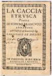 FRANCUCCI (Scipione). La caccia etrusca. Poema. Florence, Giunti, 1624. In‑8, 21,5 x 15,5 cm, …
