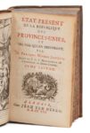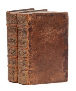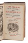 JANIÇON (François-Michel). État présent de la république des Provinces-Unies et des païs qui en dépendent. La Haye, Jean van Duren, 1729-1730. 2 vol. in‑12, 9,5 x 16 cm, XLVIII + 504pp. & XXXVIII + 536pp. (mal chiffrées 336), frontispice, reliure de l'époque en basane fauve, dos à nerfs ornés de motifs dorés. Le premier volume concerne l'organisation politique et économique des Pays-Bas, avec les relations commerciales développées avec les Indes orientales (Indonésie), le Surinam, la Baltique ou l'Europe (dont la pêche à la baleine). Le secoind traite de l'histoire et de la géographie des provinces bataves. Illustré d'un frontispice et d'une vignette de titre, répétés à chaque volume, dessinés et gravés sur cuivre par B. Picart. Dos frottés, une coiffe usée.
