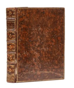 LA BRUYÈRE (Jean de). Les caractères de Théophraste et de La Bruyère… Paris, Hochereau, Panckoucke, 1765. In‑4, 21 x 29 cm, 4ff., 484pp., frontispice, reliure de l'époque en veau fauve marbré, triple filet doré en encadrement sur les plats, dos à nerfs orné de motifs dorés. Belle édition des Caractères, illustrée d'un portrait de l'auteur, gravé en frontispice d'après Saint-Jean, et de bandeaux gravés d'après Gravelot. Le portait, plus court, provient d'un autre exemplaire. Mors fendus avec manques importants, coins frottés, épidermure sur le premier plat.