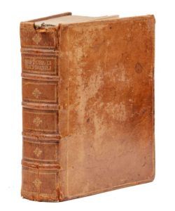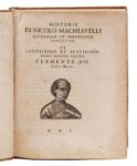 MACHIAVEL (Nicolas). Tutte le opere di Nicolo Machiavelli cittadino et secretario fiorentino, divise in V. parti, et di nuovo con somma accuratezza ristampate. [Genève, Pierre Aubert], 1550 [vers 1628]. In‑4, 16,5 x 21,5 cm, 2ff., 8 + 352pp. ; 2ff., 116pp. ; 14pp., 1 f. blanc, 304pp. ; 168pp. (mal chiffrées 158) ; 170pp., 1 f. blanc (*2, †4, A-Z4, Aa-Xx4 ; **2, a-o4, p2 ; ā4, ē4, a-z4, aa-pp4 ; aaa-xxx4 ; aaaa-xxxx4, yyyy2), reliure du temps en veau blond, double filet doré en encadrement sur les plats, dos à nerfs orné de compartiments et de fleurons dorés. Deuxième édition des cinq "della Testina" (édition B) avec le portrait de l'auteur gravé sur bois sur le titre général et ceux des quatre premières parties. Ces célèbres premières éditions complètes des œuvres de Machiavel furent publiées sans mention de lieu et d'éditeur et à la date fictive de 1550, pour s'affranchir de la censure. Belle gravure sur bois à double page (pages 124-125) et schémas typographiques dans Dell'arte della guerra. Bon exemplaire. Les deux premiers cahiers ont été inversés à la reliure. Fente entre les cahiers i et k du Discorsi. Nombreux feuillets uniformément roussis sans gravité sur le texte et quelques taches et rousseurs. Quelques notes marginales postérieures au crayon. Cachet humide du contrôleur des douanes de Varsovie (vers 1970). Coiffes arrachées, coins usés. Brunet III, 1274-1275.