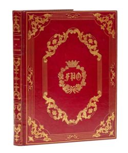 MALHERBE (François de). Poésies. Paris, Imprimé au Louvre par Didot l'Aîné, 1797. In‑4, 22,5 x 29 cm, XXVIII + 326pp., reliure des années 1830 en maroquin à grains longs cerise, larges encadrements de filets et de motifs avec chiffre couronné, dorés, au centre des plats, dos lisse orné de motifs dorés, chaînette dorée aux coupes, roulette intérieure dorée, tranches dorées, doublures et gardes de moire bleu ciel. Belle impression de Didot. Très bel exemplaire au chiffre couronné du duc d'Orléans, fils aîné du roi Louis-Philippe (OHR 2580, fer 6, qui cite cet exemplaire). De la bibliothèque Nepveu.