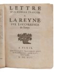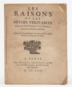MAZARINADES.— Réunion de 9 pièces en un vol. in‑4, 17,5 x 22,5 cm, broché, non rogné. Premier et dernier feuillets du recueil légèrement salis. Détail : • Les raisons ou les motifs véritables de la défence du parlement & des habitans de Paris. Contre les perturbateurs du repos public, & les ennemis du roy & de l'Estat. Paris, François Preuveray, 1649. 26pp., 1 f. blanc. • Remonstrances à la reyne régente sur le gouvernement de l'Estat. Paris, Arnould Cotinet, 1649. 8pp. • Lettre d'un gentil-homme à la reyne. Paris, veuve Théod. Pepingué & Etienne Maucroy, 1649. 8pp. • Lettre d'un fidelle François à la reyne sur l'occurrence du temps. Paris, François Preuveray, 1649. 12 pages. • Lettre d'un religieux, envoyée à monseigneur le prince de Condé, à S. Germain en Laye. Contenant la vérité de la vie & mœurs du cardinal Mazarin. Avec exhortation audit seigneur prince d'abandonner son party. Paris, Arnould Cotinet, 1649. 12pp. • Discours d'Estat et de religion sur les affaires du temps présent. À la reine. [Paris, Arnould Cotinet, 1649]. 8pp. • Factum servant au procez criminel fait au cardinal Mazarin, touchant ses intelligences avec les estrangers ennemis de l'Estat. [Paris, veuve I. Guillemot, 1649]. 8pp. •Lettre du chevalier Georges de Paris. À monseigneur le prince de Condé. Paris, [Nicolas Boisset], 1649. 18pp., 1 f. blanc. • Contribution d'un bourgeois de Paris, pour sa cotte-part au secours de sa patrie. 1649. 8pp.