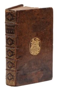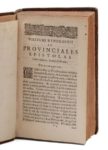[PASCAL (Blaise)]. Ludovici Montaltii Litteræ provinciales, de morali et politica jesuitarum disciplina. A Willelmo Wendrockio., e gallica[m] in latinam linguam translatæ. Cologne [Leyde], Nicolas Schouten [Elsevier], 1658. In‑8, 11 x 18,5 cm, 16ff., 608pp., reliure de l'époque en veau brun, armes dorées au centre des plats, dos à nerfs orné de motifs dorés. Première traduction latine des Provinciales, donnée par le théologien janséniste Pierre Nicole (1625-1695), sous le pseudonyme de William Wendrock, qui y ajouta de nombreuses notes. Deux feuillets (addenda et errata) ont parfois été reliés à la fin. Ils ne se trouvent pas dans cet exemplaire (signe de premier tirage ?) Exemplaire aux armes de Jean de la Valette-Cornusson (OHR 2141), abbé commendataire de l'abbaye de Beaulieu (diocèse de Rodez). Légères rousseurs. Mouillure sur le premier plat. Coiffes usées, un mors fendu, coins usés. Willems 829 (qui ne mentionne pas les 2ff. d'addenda et d'errata).