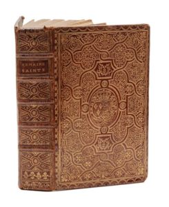RELIURE AUX ARMES.— L'office de la Semaine sainte, en latin et en françois… Dédié à la reine pour l'usage de sa maison. Paris, Jean-BaptisteGarnier, 1752. In‑8, 20 x 12,5 cm, 1 f., XLVIII + 852pp., 3pl., reliure de l'époque en maroquin rouge, roulette dorée en encadrement (anses de tiroir), plaque à décor d'entrelacs et de motifs au pointillé, armes dorées au centre des plats flanquées du chiffre M, roulette intérieure dorée, tranches dorées, doublure et gardes de papier d'Augsbourg. Illustré de 3 figures gravées sur cuivre, dont une par Duflos, d'un bandeau, de culs-de-lampe et de lettrines gravées sur bois. Riche reliure ornée d'une plaque de style fanfare tardive aux armes et au chiffre de la reine Marie Leczinska (1703-1768). Des bibliothèques de Suzanne du Petit-Thouars (1740-1823), chanoinesse du chapitre noble de Salles-en-Beaujolais (inscription manuscrite au recto du premier feuillet blanc, le livre lui a été donné par une de ses tantes en 1757), Lambert-Lesage (étiquette) et Octave Nepveu. Plusieurs cahiers un peu jaunis. Charnières un peu frottées, petits accidents aux coiffes et coins émoussés. Reliure un peu voilée.